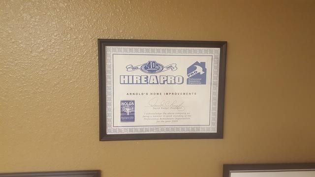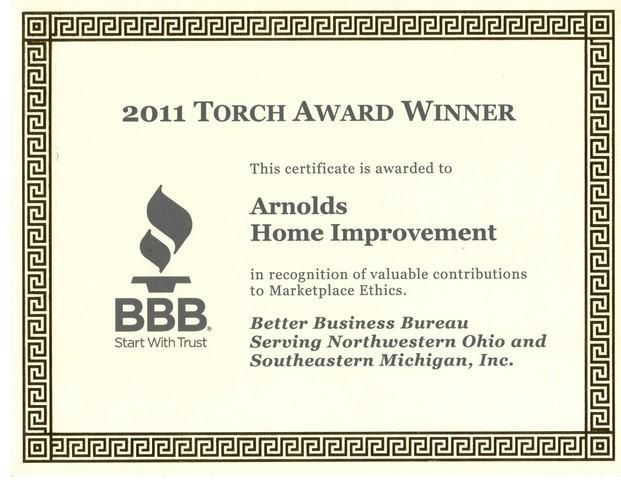 Arnolds Home Improvement won Large Business in 2011. The Northwest Ohio Better Business Bureau gives award to ethical companies that display truthful advertising and honest business