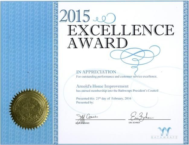 Awarded to Arnold's Home Improvement in appreciation for outstanding performance and customer service excellence; Arnold's Home Improvement was granted membership into the Bathwraps President's Council.