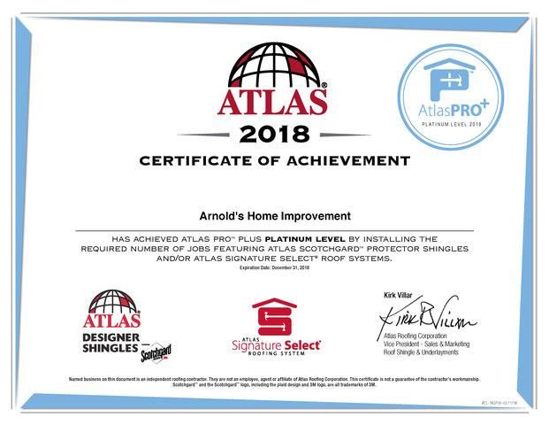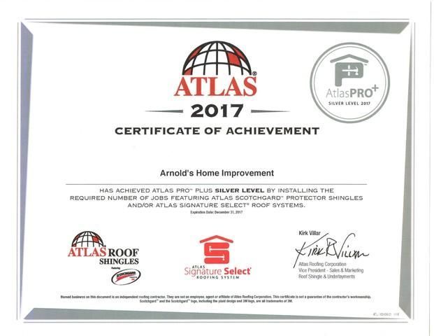 Arnold's Home Improvement has achieved Atlas Po Plus Silver Level by installing the required number of jobs featuring Atlas Scotchgard Protector Shingles and/or Atlas Signature Select Roof Systems. Awarded on Friday, September 1st, 2017.