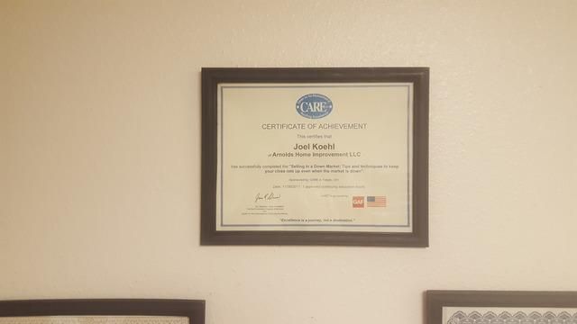Joe Koehl of Arnolds Home Improvement has sucessfully completed the "Selling in a down market: Tips and techniques to keep your close rate up even when the market is down."