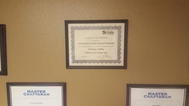 Certificate recognizing Arnolds Home Improvements partnership with Maumee Valley Habitat for Humanity.